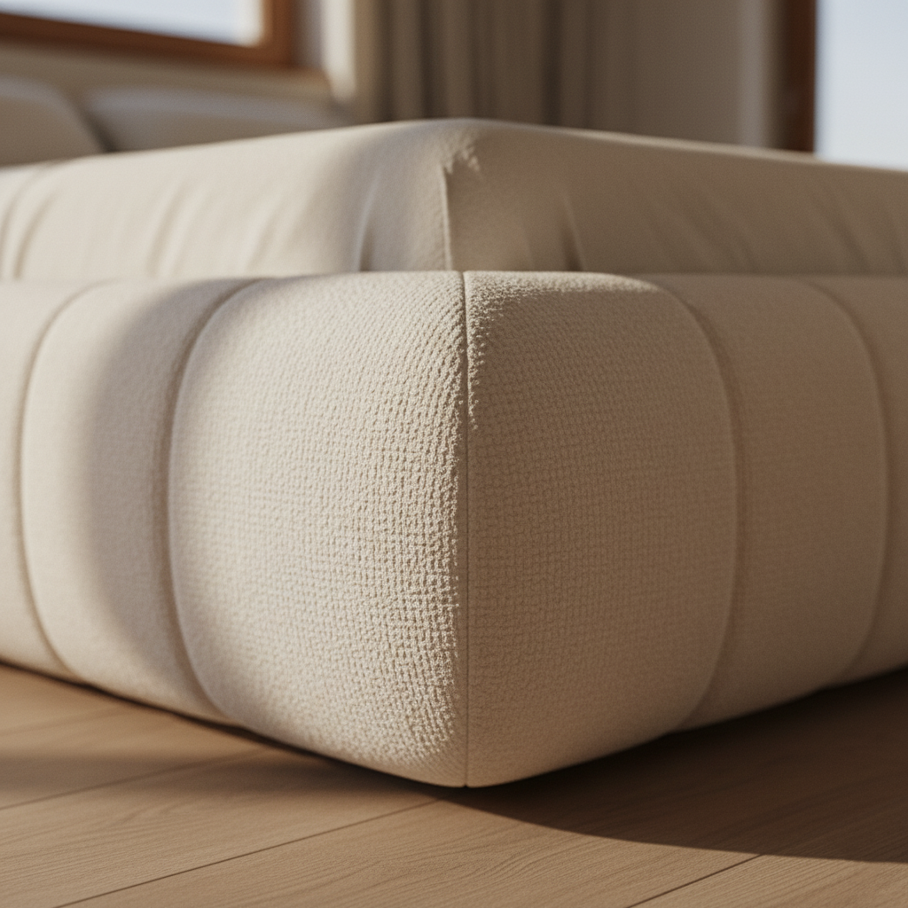 Yumuşak dokulu yüzeyi, ışığı nazikçe yansıtarak baza formuna derinlik ve hacim katar. Bu özel kumaş, dokunulduğunda kadifemsi bir his verirken, dayanıklı yapısıyla uzun yıllar boyunca ilk günkü formunu korur.