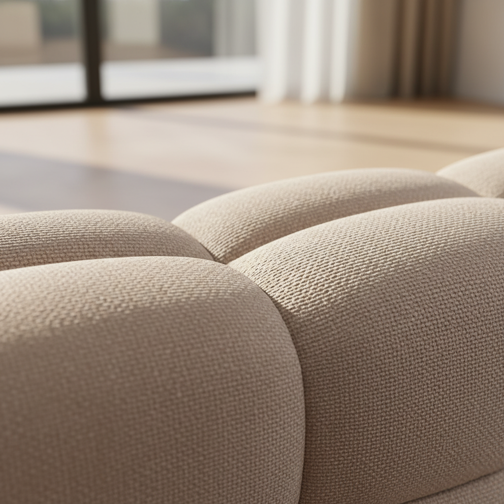 Yoğun dokulu yüzeyi, ışığı zarif biçimde yansıtarak baza formuna derinlik ve hacim kazandırır. Bu özel kumaş, dokunulduğunda kadifemsi bir yumuşaklık hissi verirken, dayanıklı yapısıyla uzun yıllar boyunca ilk günkü formunu korur.