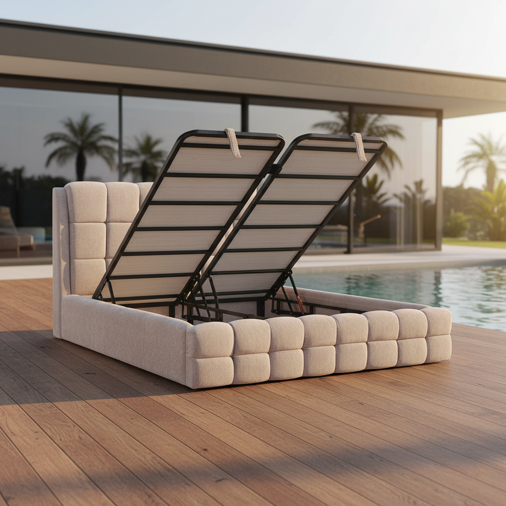 Yüksek iç hacmiyle eşyalarınızı kolayca düzenlemenize olanak tanırken, baza altını ferah ve hijyenik tutan tasarımıyla pratik kullanım sunar. Yumuşak döşemesi, dolgun formu ve zarif dikiş hatlarıyla yatak odanıza hem estetik bir bütünlük hem de konforlu bir huzur alanı kazandırır.